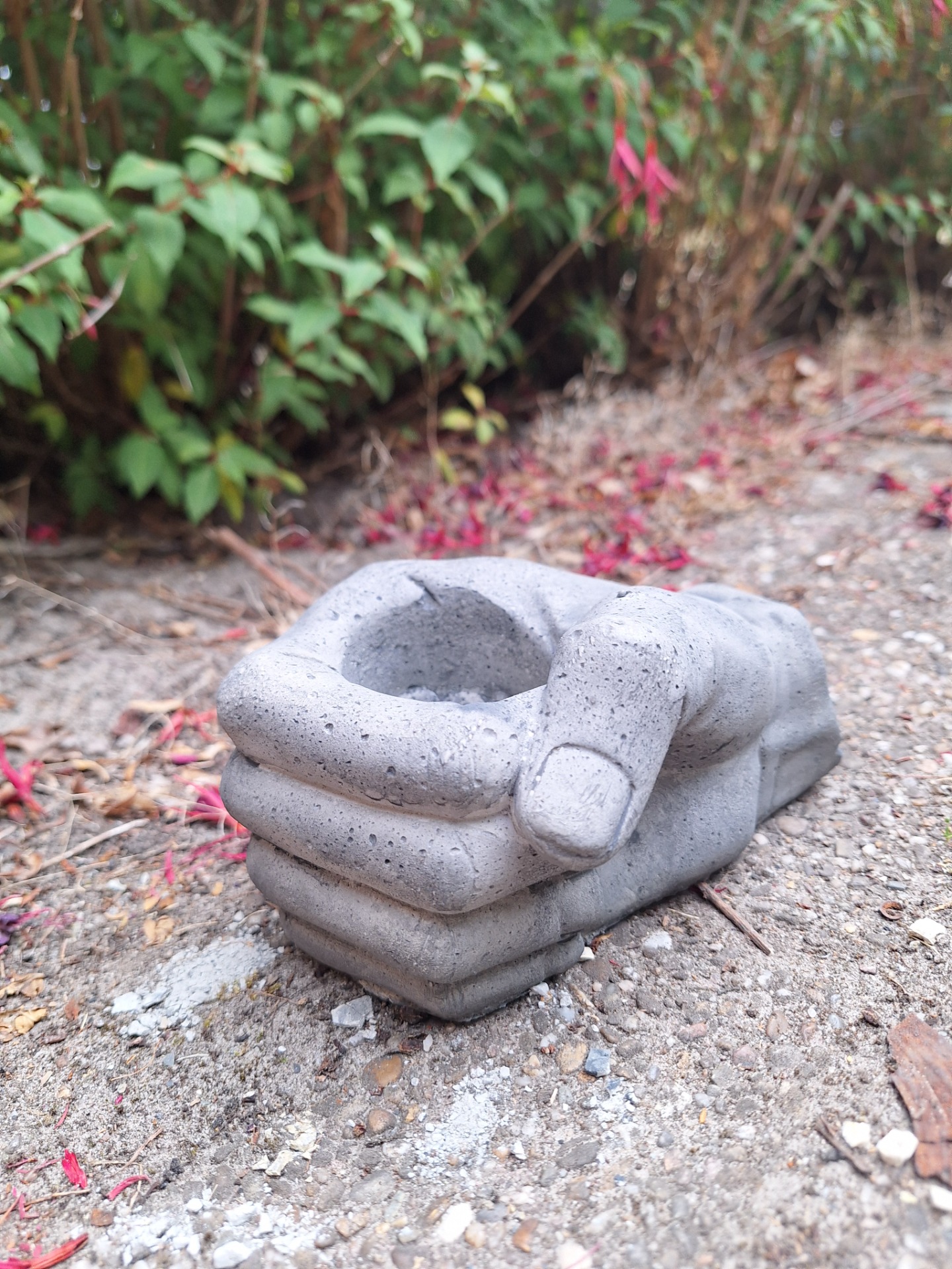 Een gevouwen handenschaal van 14cm hoog en met een diameter van 19cm. Deze schaal weegt ongeveer 6 KG.