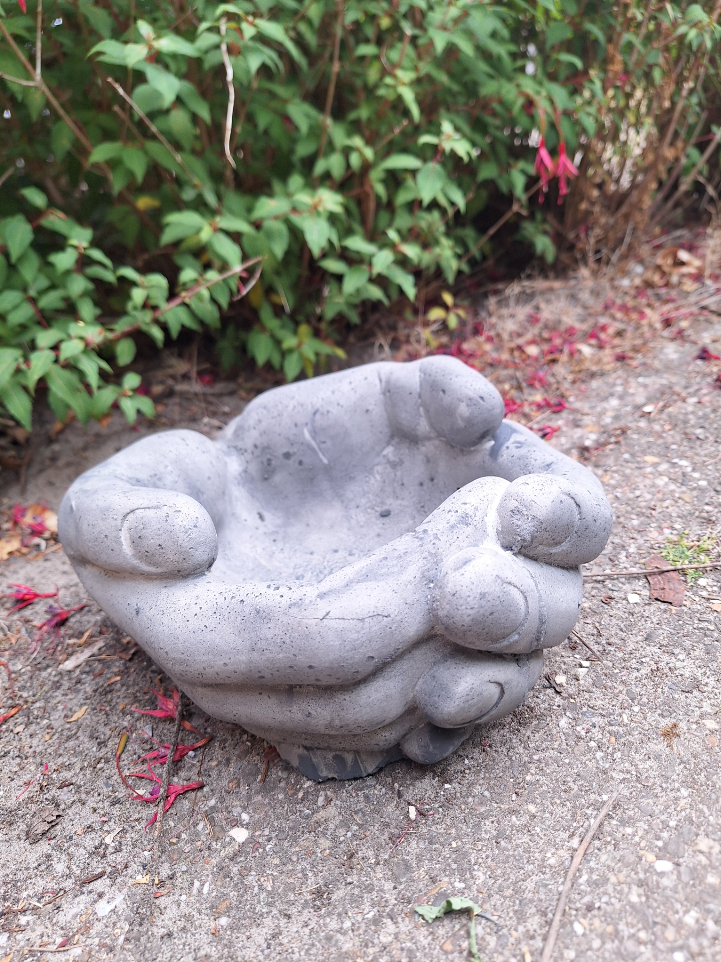 Een gevouwen handenschaal van 14cm hoog en met een diameter van 19cm. Deze schaal weegt ongeveer 6 KG.