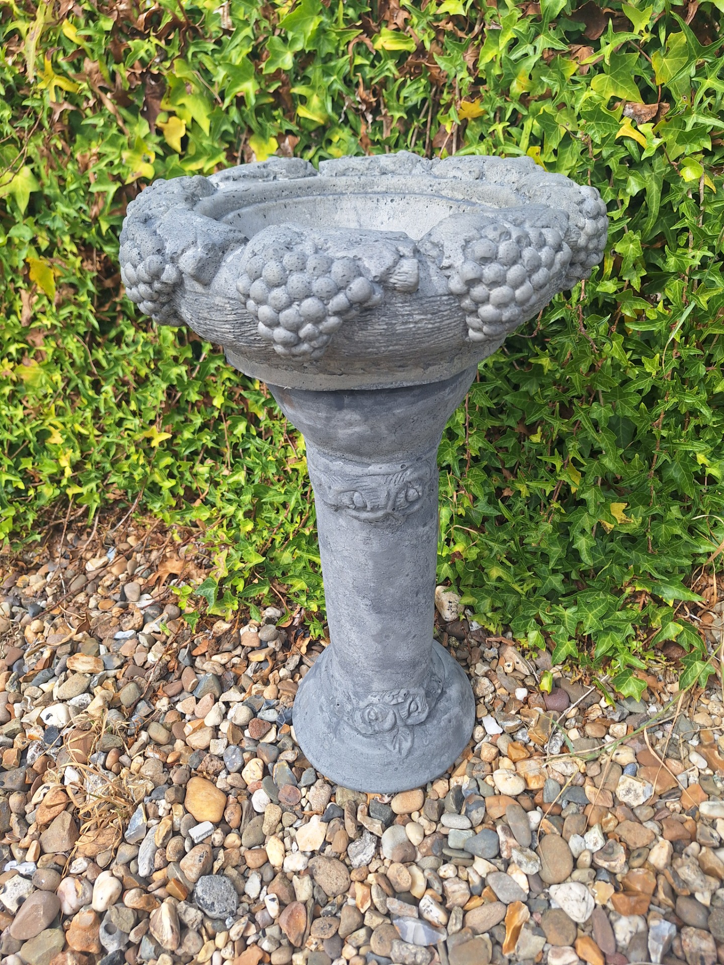 Een vogelbad van 53cm hoog en met een diameter van 30cm. Het vogelbad weegt ongeveer 14 KG.